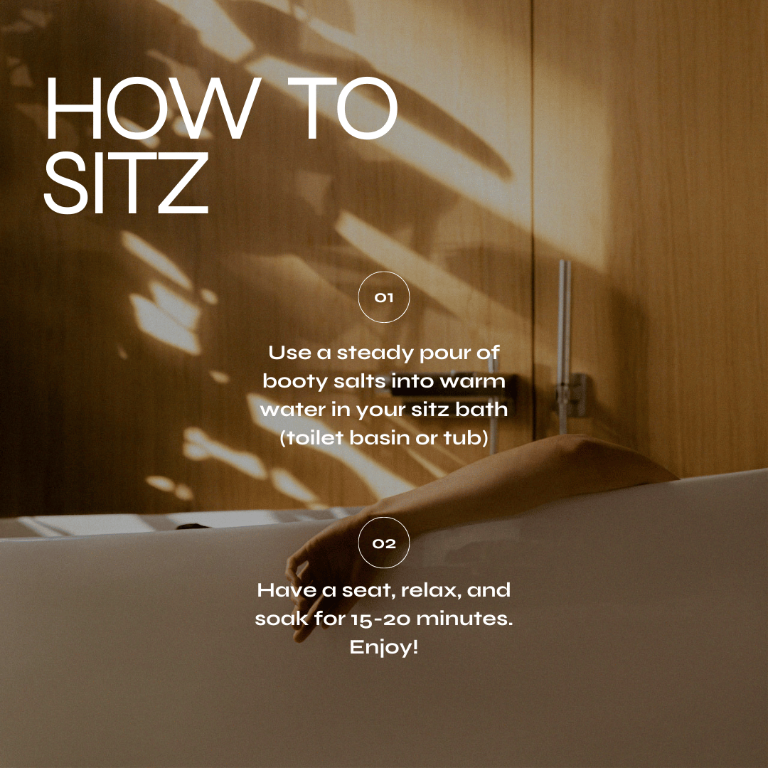 For use in a toilet sitz basin (recommended): Use a steady pour (2-3 seconds) of booty salts into your sitz bath water. Have a seat, relax, and soak for 15-20 minutes.